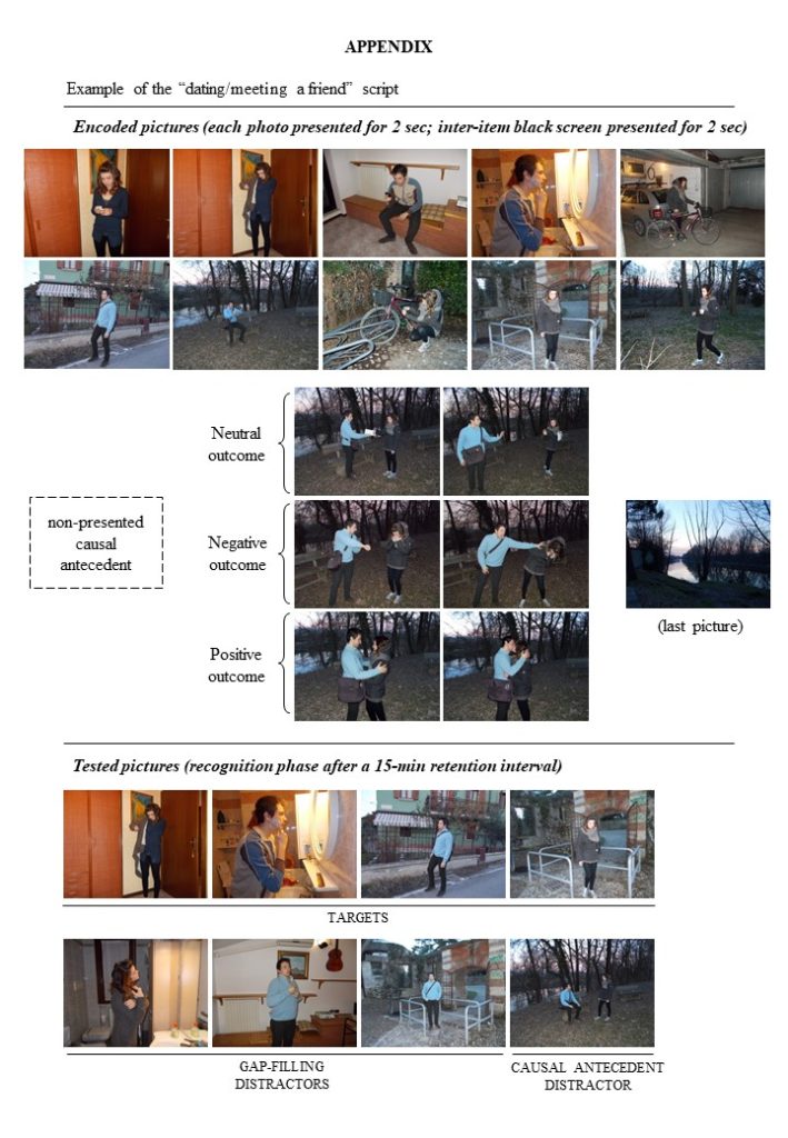 We developed a new False memory paradigm (Mirandola et al., 2014; Mirandola et al., 2017) that enables us to study memory distortions for emotional events that may occurr in everyday life. For example, if you observe a story (depicted through pictures) where a boy and a girl get ready to meet each other, you may produce two types of false memories: 1) erroneously remembering an action that is consistent with the story/script but that was not presented (the boy brushing his teeth while he was shaving); 2) inferring having seen the antecendent of an action emotionally salient (why is the boy mad at the girl? Probably she was late to the date).